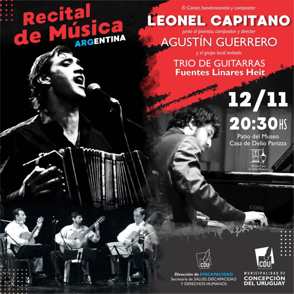 En el Mes de la Convivencia Plena, la Dirección para la Inclusión de las Personas con Discapacidad organiza el Recital de Música Argentina. Contará con la actuación del cantante, compositor, autor y bandoneonista Leonel Capitano, quien será acompañado por el pianista Agustín Guerrero. Además, se presentará el “Trío de Guitarras Fuentes-Linares Heit”, como grupo local invitado.