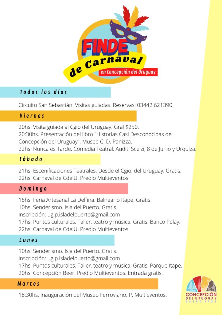 Desde la Dirección de Turismo, se realizó una síntesis de todas las actividades previstas para este fin de semana que comienza este sábado y culmina el próximo martes 1 de marzo. En principio, comunicó que todos los días se realizará la tradicional recorrida guiada por el circuito San Sebastián. Las y los interesados podrán realizar las reservas al 3442621390, para ser guiados y de esta manera organizar los distintos grupos.