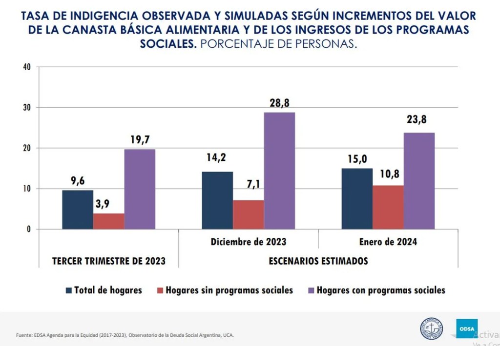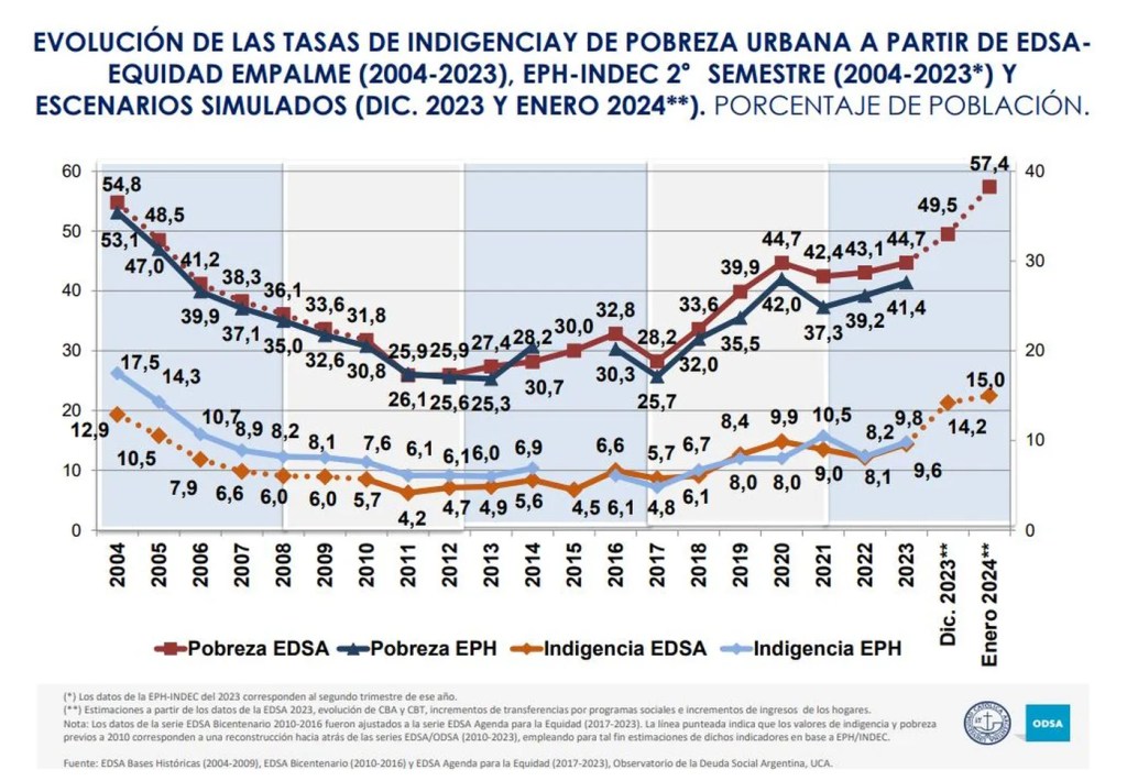 El Observatorio de la UCA proyecta que la población en situación de indigencia pasó del 9,6% en el tercer trimestre de 2023 al 14,2% en diciembre de 2023 y al 15% en enero de 2024 y el nivel de pobreza, en tanto, subió del 44,7% observado en el tercer trimestre de 2023 al 49,5% en diciembre y al 57,4% en enero de este año.