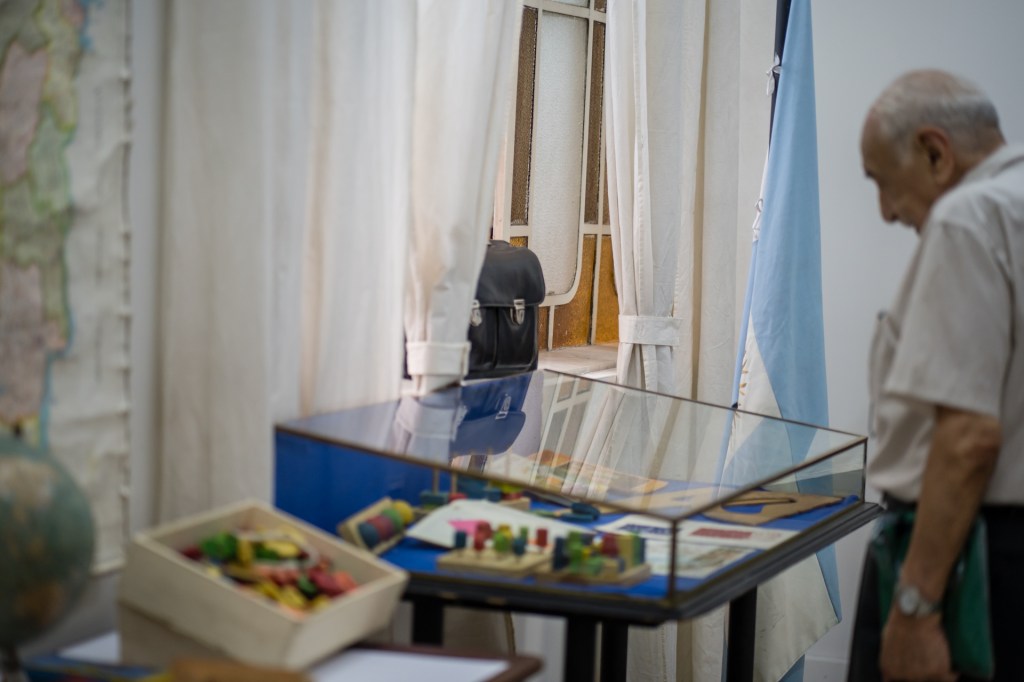 Como no podía ser de otra manera, se encuentran exhibidos un impecable guardapolvo, un portafolios de cuero negro, ejemplares de la Revista Mundo Infantil y en estos días se sumarán más fotos de cursos en distintas escuelas, y materiales que evocarán cómo eran los recreos en los patios, varias décadas atrás.