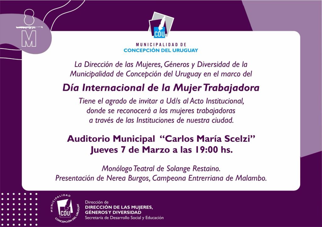 En primer lugar, el jueves 7 de marzo en el Auditorio Scelzi, se realizará un acto institucional por el Día Internacional de la Mujer Trabajadora a partir de las 19:00 horas. Allí, se brindará reconocimiento y visibilización a las mujeres a través de las instituciones de nuestra ciudad. Habrá, además, un monólogo teatral de Solange Restaino y una presentación de Nerea Burgos, Campeona Entrerriana de Malambo.