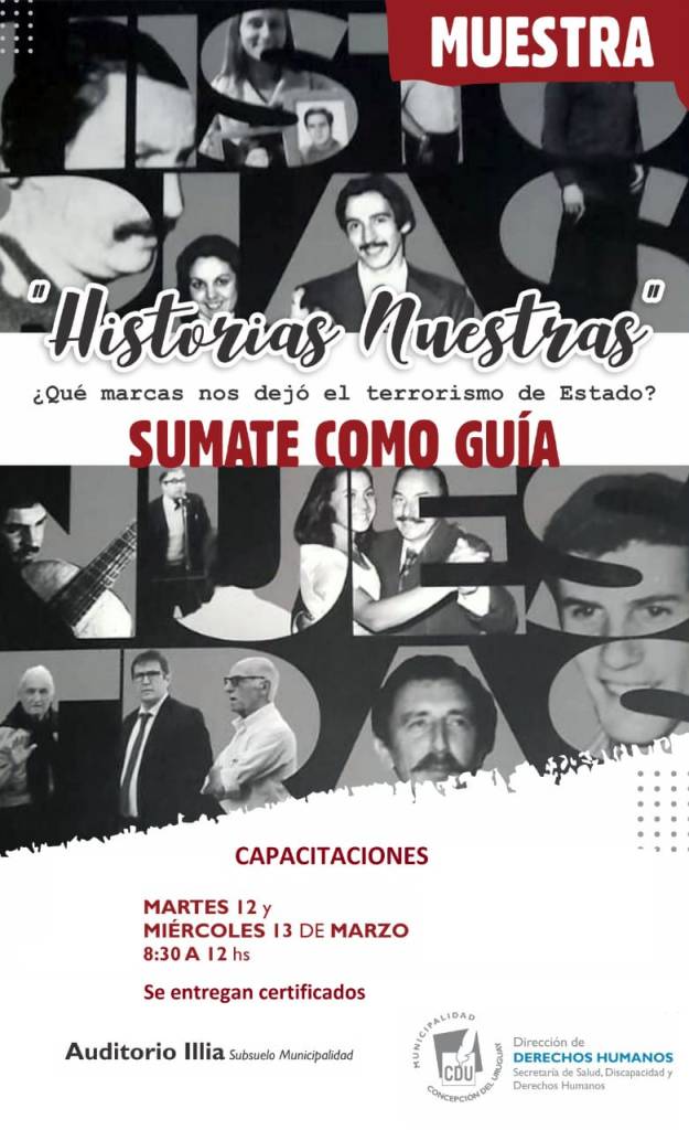Serán capacitadas las personas que se desempeñarán como guías de la exposición «Historias Nuestras», sobre personas detenidas-desaparecidas de Concepción del Uruguay. Las capacitaciones se desarrollarán en el Auditorio Municipal Illia los días martes 12 y miércoles 13 de marzo.