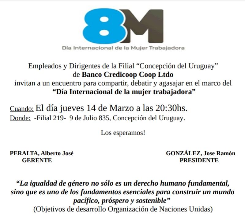 Será reconocida por la comisión de asociados y asociadas de la filial 219 Concepción del Uruguay del Banco Credicoop que realizará un encuentro, debate y agasajo desde las 14 a las 20.30 hs en 9 de Julio 835 en el marco del “Mes de la Mujer”.
