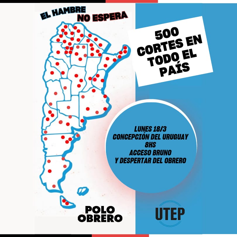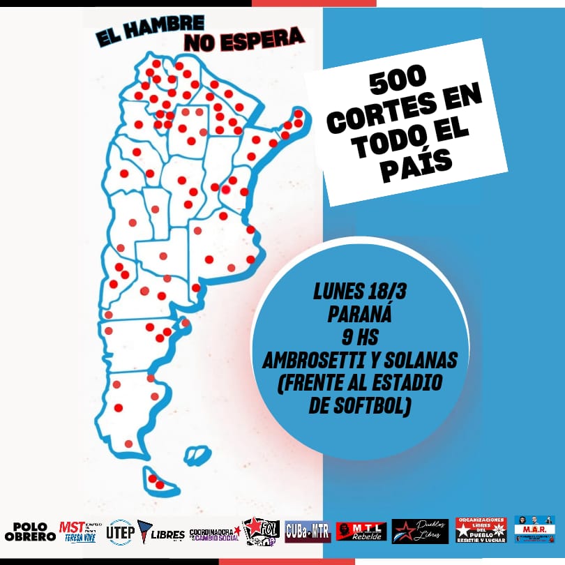 Este lunes 18 de Marzo se llevará adelante una jornada nacional, cuando organizaciones sociales y sindicales, con cabecera en el puente Pueyrredon y más de 500 cortes y movilizaciones en todo el pais se desplieguen profundizando el plan de lucha frente a la falta absoluta de respuesta del gobierno ante la emergencia alimentaria y el ajuste a la economía popular.