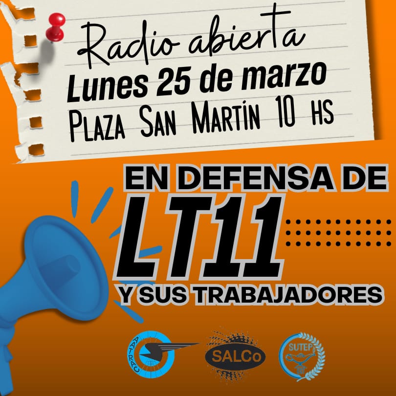 Titulado «POR UNA LT11 PÚBLICA Y DE SUS TRABAJADORES, CON DERECHOS, SIN DESPIDOS NI BÁSICOS DE INDIGENCIA» el comunicado dice que el lunes 25 de marzo a las 10 hs las y los trabajadores de LT11 salimos a la calle con una radio abierta en Plaza San Martín a denunciar el estado de abandono de la emisora y por todas las reivindicaciones.
