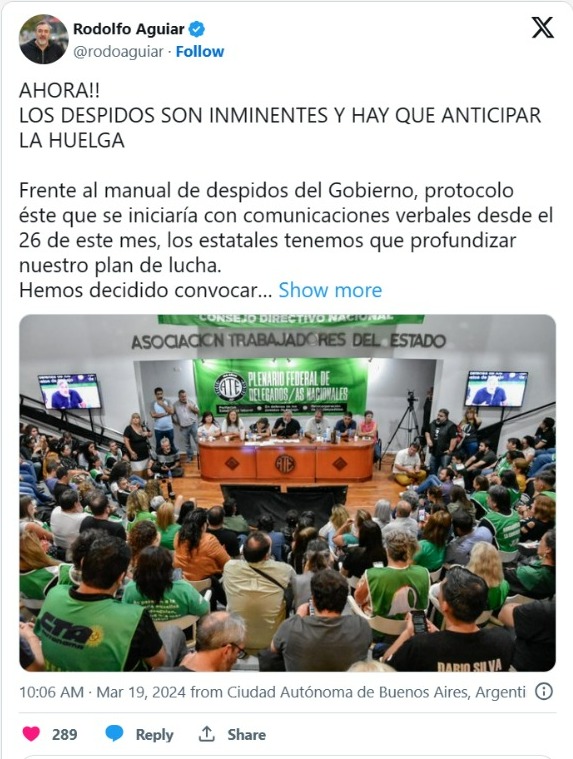 «Es inminente el despido de miles de estatales. Tenemos que profundizar nuestro plan de lucha y definir medidas de fuerza que nos permitan evitar un escenario de cesantías masivas a fin de mes», expresó el secretario general de ATE, Rodolfo Aguiar, quien convocó a una reunión del Consejo Nacional del gremio para mañana a las 10. El objetivo del encuentro es convocar con urgencia a un paro general. “Los tiempos se aceleran y no podemos esperar hasta abril”, agregó. El dirigente estima que a raíz del fin de semana largo, las notificaciones se enviarán entre el martes 26 y el miércoles 27. «Se están erradicando derechos, destruyendo puestos de empleo y demoliendo los ingresos de los trabajadores, jubilados y sectores populares. Las centrales obreras deberían evaluar anticipar su llamado a una nueva huelga nacional», completó Aguiar.