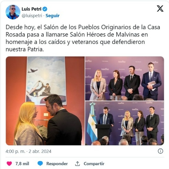 En el Día del Veterano y de los Caídos en la Guerra de Malvinas, el Gobierno nacional anunció el cambio de nombre del Salón de los Pueblos Originarios de la Casa Rosada, para llamarlo Salón de los Héroes de Malvinas.
