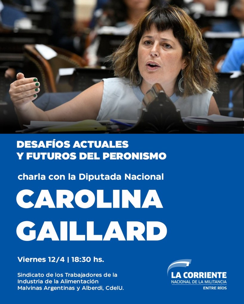 La invitación que circula dice Este viernes 12 de abril nos encontramos con la compañera Diputada Nacional Carolina Gaillard para intercambiar entre todos cuáles son los desafíos que nos convocan en medio de una escalada de medidas recesivas que nada bueno pueden significar para el pueblo trabajador. Una mirada puesta en lo que nos debemos replantear como parte de un movimiento que siempre ha sido defensor de derechos para las mayorías. Un análisis de la coyuntura para reflexionar cuáles son esos desafíos del presente y pensar los del futuro.
