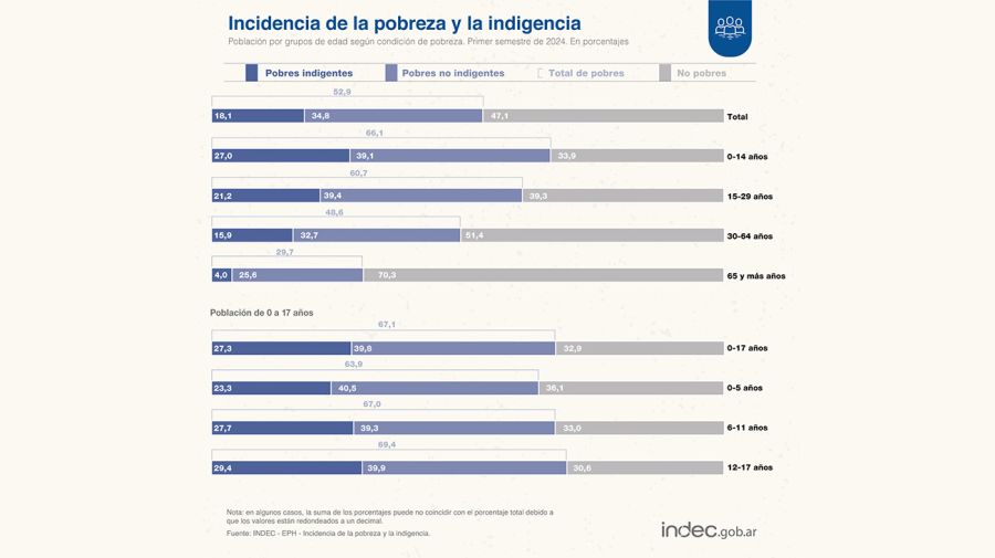 El segmento de niños de 0 a 14 años fue el más afectado por el aumento de la pobreza a 52,9% durante el primer semestre de 2024. Además, la indigencia trepó a 18,1%.