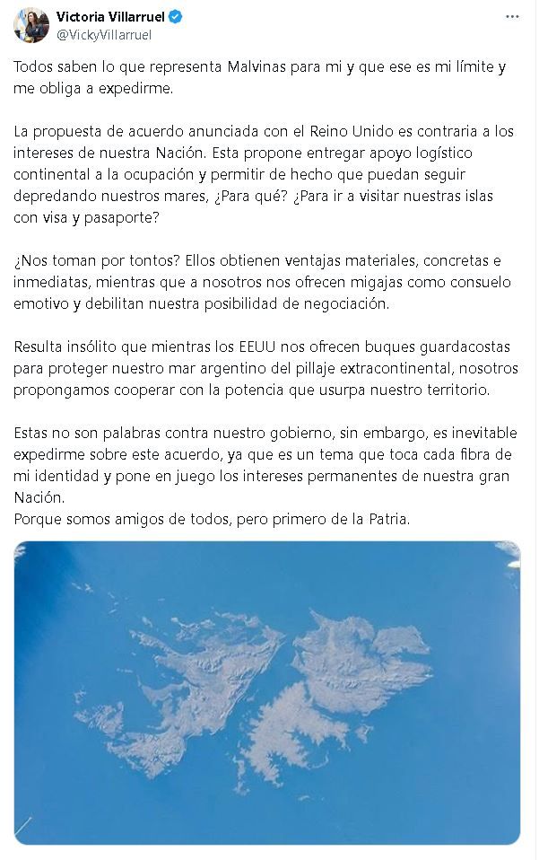 Desde el entorno de Villarruel, una figura emblemática dentro de la coalición por su postura intransigente en temas de soberanía, señalan que la vicepresidenta no se detuvo a consultar antes de emitir su opinión. «Sabían que no estaba de acuerdo. Y cuando es Malvinas, no pide permiso, ella sola se da vía libre para opinar», afirmaron fuentes cercanas a la vicepresidenta, dejando en claro que su postura es firme e inamovible.