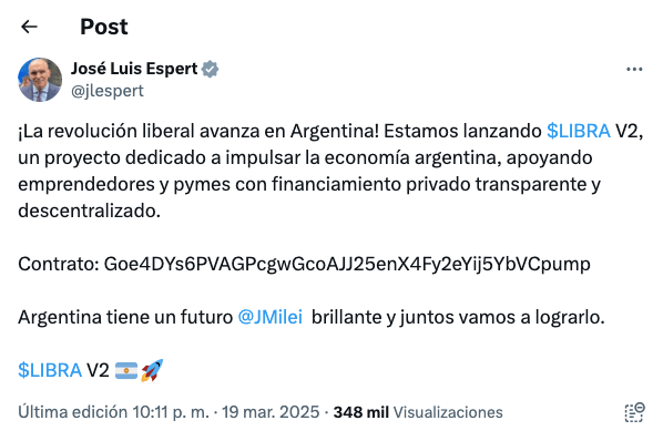 A las 22:11 un tuit de la cuenta del diputado habla del lanzamiento de la versión dos de $Libra al que refiere como «un proyecto dedicado a impulsar la economía argentina, apoyando emprendedores y Pymes». El posteo incluye un enlace al supuesto contrato de la criptomoneda. Sobre el final dice: «Argentina tiene un futuro Javier Milei y juntos vamos a lograrlo».