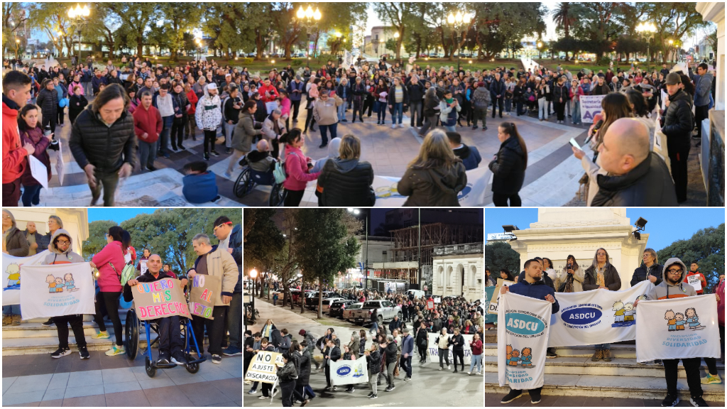 En este marco se reunieron en el centro de Plaza Ramírez personas con discapacidades, sus familiares, prestadores, alumnas y alumnos de escuelas especiales y vecinos uruguayenses, en general, para manifestarse en defensa de sus derechos. En contra del veto de Milei.