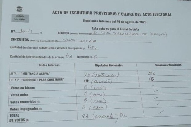 En seccionales TRADICIONALES de Paraná se vieron números atípicos de votantes, lo que denota la decadencia del que fuera el partido que gobernó la provincia cuando regresó la democracia. En la seccional 12, apenas 43 afiliados se acercaron a votar de los 1754 habilitados; en la 13, solo se hicieron presentes 70; y en la seccional tercera, solo 27, lo que constituye un 3% para una jornada bochornosa que pone de manifiesto la escasa representatividad de los dirigentes que se aliaron con Frigerio. En Concordia, , unos 800 los afiliados hicieron uso de su derecho a votar. DATOS EXTRAOFICIALES.